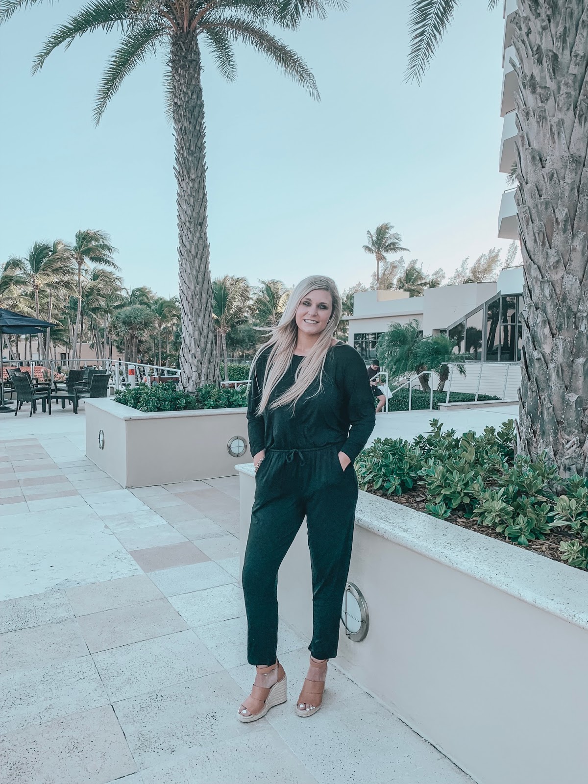 Happy Thursday, babes! I am sooo happy because it has finally been fall temps this week! Wellll- kinda. The mornings have been way too cold, like I'm talking 30s and frosty cars....toooo soon! But later in the day with the sun shining, it actually feels nice! Perfect cardigan/ coat/ sweater weather! On the other hand, I wanted to share the comfiest jumpsuit I've ever owned with you all. I wore this look in Florida and I wanted to live in this jumpsuit lol. It is that super soft and stretchy material that you could just live in. I was on the search for a really good solid black jumpsuit for awhile and this one for sure won! It has a tie waist which adds cute detail. I also love that it's skinny leg style so it looks perfect with wedges or sandals! It can definitely be styled up or down based on the shoes you wear! I paired it with my favorite wedges that are linked above. They are so neutral and are sooo comfortable. I could seriously go shopping in them, lol!